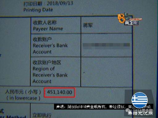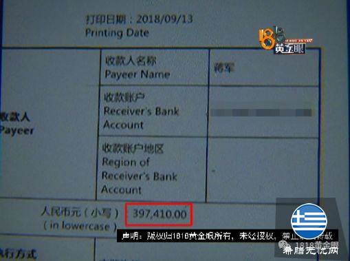 徐先生有两张图片,他说是希腊那家房产公司的人发给他的,上面显示,去年九月,有八十四万八千多元的款项,分两笔打进了一位蒋先生的银行账户,徐先生说,这位蒋先生,就是天丰公司的负责人。