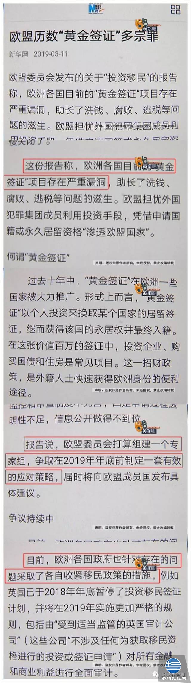 小吴表示,他们会先等待侨外方面的消息,并进行沟通。关于黄金签证,新华网转载《环球》杂志的一篇文章提到,今年1月23号,欧盟委员会发布的关于投资移民报告出台,报告中说,欧洲各国目前的黄金签证项目存在严重漏洞,草率的发放签证和护照存在重大风险,欧盟委员会打算成立一个专家组,争取在2019年年底前,制定一套有效的应对策略。目前,欧洲各国政府也针对存在的问题,采取了各自收紧移民政策的措施。