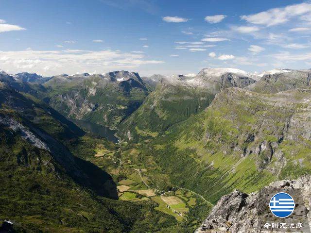 左边就是挪威最知名的挪威缩影城市Geiranger盖伦格,右边则能尽览Geirangerfjord盖伦格峡湾美景,那直接垂直上升水平面的绵延山脉。