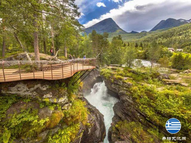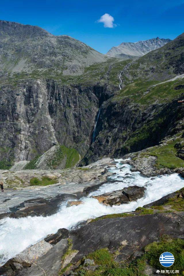 (路线:精灵之路 ➝ Trollstigen Senter观景台 ➝ Gudbrandsjuvet峡谷 ➝ 开车搭渡轮过峡湾 ➝ 老鹰之路)。第一站:从E136号公路转进63号景观公路时,首先就是跨过Rauma河的单线道桥面,会看到桥上挂著63号以及下方”挪威国家景观公路”的道路交通号志。在路宽仅4~6米的蜿蜒道路上就拥有11个发夹弯,之间往上或往下开,一旁是高悬的飞瀑、一旁是陡峭的悬崖。