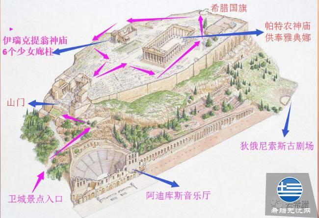 她位于雅典城中心偏南的一座小山顶的台地上,高出平地约70~80米。