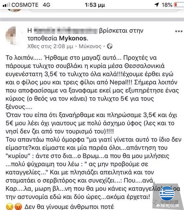 这位希腊游客将她的经历发到了Facebook上。她写到,虽然餐馆老板向她和她的男朋友(也是一名希腊人)在购买Souvlaki时每人仅被收取了3.5欧元,但是同行的外国朋友在购买同样的食物时却被要求每人支付5欧元。