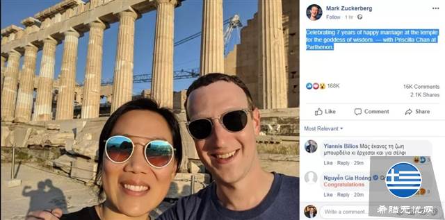 脸书(Facebook)董事长兼CEO马克·扎克伯格5月17日与妻子普莉希拉·陈到访雅典卫城,庆祝他们结婚7周年。