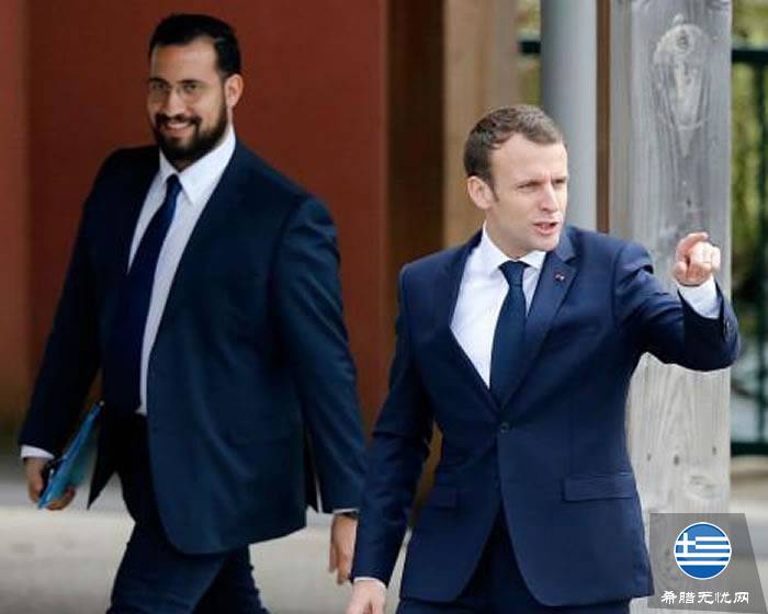 图为法国总统马克龙和涉事保镖贝纳拉 (Alexandre Benalla)
