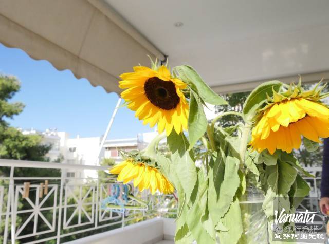 迪米特里斯打开阳台的门,我们走进阳台,立刻被惊呆了,从来没有见过这么大的阳台!估计有十个平方,坐在这么大的阳台上晒太阳可真是太舒服了。