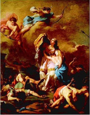 坦塔罗斯是宙斯的儿子,他统治着吕狄亚的西庇洛斯,以富有而出名。由于出身高贵,诸神对他十分尊敬。他可以跟宙斯同桌用餐,不用回避神衹们的谈话。可是他的虚荣心又使他实在不配享有天上的福祉,于是,他开始对诸神作恶。他泄露他们生活的秘密;从他们的餐桌上偷取蜜酒和仙丹,并把它们分给凡间的朋友。他把别人在克里特的宙斯神庙里偷走的一条金狗藏在家里。坦塔罗斯窝藏脏物,拒不交出,将金狗窃为己有。有一天,他邀请诸神到家中作客。为了试探一下神衹们是否通晓一切,他让人把自己的儿子珀罗普斯杀死,然后煎烤烧煮,做成一桌菜,款待他们。在场的谷物女神得默忒耳因思念被抢走的女儿珀耳塞福涅,在宴席上心神不定,只有她出于礼貌稍微尝了一块肩胛骨。别的神衹早已识破了他的诡计,纷纷把撕碎的男孩的肢体丢在盆里。命运女神克罗托将他从盆里取出,让他重新活了过来,可惜肩膀上缺了一块,那是被得默忒耳吃掉的,后来只好用象牙补做了一块。