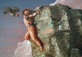 普罗米修斯曾经警告过他的弟弟,不要接受奥林匹斯山上的宙斯的任何赠礼,而要立即把它退回去。可是,埃庇米修斯忘记了这个警告,很高兴地接纳了这个年轻美貌的女人。直到后来,他吃了苦头,才意识到他招来了灾祸。在此之前,人类遵照普罗米修斯的警告,因此没有灾祸,没有艰辛的劳动,也没有折磨人的疾病。现在,这个姑娘双手捧上礼物,这是一只紧闭的大盒子。她一走到埃庇米修斯的面前,就突然打开了盒盖,里面的灾害像股黑烟似地飞了出来,迅速地扩散到地上。盒子底上还深藏着唯一美好的东西:希望,但潘多拉依照万神之父的告诫,趁它还没有飞出来的时候,赶紧关上了盖子,因此希望就永远关在盒内了。从此,各种各样的灾难充满了大地、天空和海洋。疾病日日夜夜在人类中蔓延,肆虐,而又悄无声息,因为宙斯不让它们发出声响。各种热病在大地上猖獗,死神步履如飞地在人间狂奔。接着,宙斯向普罗米修斯本人报复了。他把这名仇敌交到赫淮斯托斯和两名仆人的手里,这两名仆人外号叫做克拉托斯和皮亚,即强力和暴力。他们把普罗米修斯拖到斯库提亚的荒山野岭。在这里,他被牢固的铁链锁在高加索山的悬岩上,下临可怕的深渊。赫淮斯托斯不太情愿执行父亲的命令,因为他很喜欢这位提坦神的儿子,他是他的亲戚,同辈,是他的曾祖父乌拉诺斯的子孙,也是神衹的后裔。可是,执行残酷命令的两个粗暴的仆人,因他说了许多同情的话,把他痛斥了一顿。普罗米修斯被迫锁在悬岩绝壁上,他给直挺挺地吊着,无法入睡,无法弯曲一下疲惫的双膝。"不管你发出多少哀诉和悲叹,都是无济于事的,"赫淮斯托斯对他说,"因为宙斯的意志是不可动摇的,这些最近才从别人手里夺得权力的神衹们都是非常狠心的。"这位囚徒被判受折磨是永久的,至少也得三万年。尽管他大声悲叫,并且呼唤风儿、河川、大海和万物之母大地,以及注视万物的太阳来为他的苦痛作证,但是他的精神却是坚不可摧的。"无论谁,只要他学会承认定数的不可制服的威力,"他说,"就必须承受命中注定的痛苦。"宙斯再三威逼他,要他说明他的不吉祥的预言,即"一种新的婚姻将使诸神之王面临毁灭",①但他始终没有开口。宙斯言出必行,每天派一只恶鹰去啄食被缚的普罗米修斯的肝脏。肝脏被吃掉多少,很快又恢复原状。这种痛苦的折磨他不得不忍受,直到将来有人自愿为他献身为止。