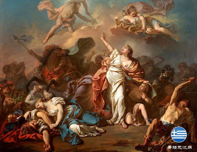 在提洛斯的库恩托斯山顶上,勒托带着一对双生子女,用一双神眼,把远方底比斯发生的一切都看得清清楚楚。"你们看,孩子,"她说,"我作为你们的母亲为生下你们而感到自豪。除了赫拉以外,我不比任何女神低微,今天却被一个傲慢的人间女子侮辱了一番。如果你们不支持我,我将被她赶出古老的圣坛。我的孩子,连你们也遭到尼俄柏的恶毒诅咒!"福玻斯打断了母亲的话,他说:"别生气,她早晚会遭到惩罚!"他的妹妹也随声附和。说完,兄妹二人都隐身在云层背后。不一会,他们就看到了卡德摩斯的城墙和城堡。城门外是一片宽阔的平地,那是供车马比赛的演武场。尼俄柏的七个儿子正在那里戏嬉。有的骑着烈性野马,有的进行着激烈的比武竞赛。大儿子伊斯墨诺斯正骑着快马绕圈奔驰,突然,他双手一抬,缰绳啪的一声滑落,原来一支飞箭射中他的心脏,他顿时从马上跌落下去。他的兄弟西庇洛斯在一旁听到空中飞箭的声音,吓得连忙伏鞍逃跑,可是仍被一支飞箭射中,当场毙命,从马上滚落下来。另外两位兄弟,一个以外祖父的名字命名的坦塔罗斯,另一个是弗提摩斯,两人正抱在一起角力,这时他们听见弓弦响起,结果被一支飞箭双双穿透射死。第五个儿子阿尔菲诺看到四个哥哥倒地身亡,便惊恐地赶了过来,把哥哥们冰冷的肢体抱在怀里,想让他们重新活过来,不料胸口也遭到阿波罗致命的一箭。第六个儿子达玛锡西通是个温柔的、留着长发的青年,他被射中膝盖。正当他弯下腰去,准备用手拔出箭镞的时候,第二箭从他口中穿过,他血流如注,倒地而亡。第七个儿子还是个小男孩,名叫伊里俄纽斯,他看到这一切,急忙跪在地上,伸开双手,哀求着:"呵,众神哟,请饶恕我吧!"哀求声尽管打动了可怕的射手,可是射出的利箭再也收不回来了。男孩扑的一声倒在地上死了,只是痛苦最轻。