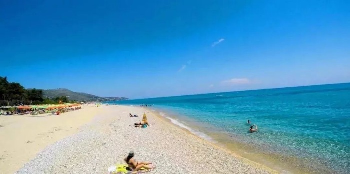 这片海滩环境优美,被郁郁葱葱的群山环绕,遍布白色鹅卵石,海水碧绿清澈,加上游玩设施完善,是一处休闲度假的完美之选。