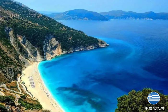 Myrtos海滩,位于凯法利尼亚岛西北部,处于两座大山脚下,绵延海岸线长达3公里。海滩上铺满了洁白鹅卵石,一直延伸进入海水中,周围郁郁葱葱的山峦与蓝色海洋交织一起,景色宜人。